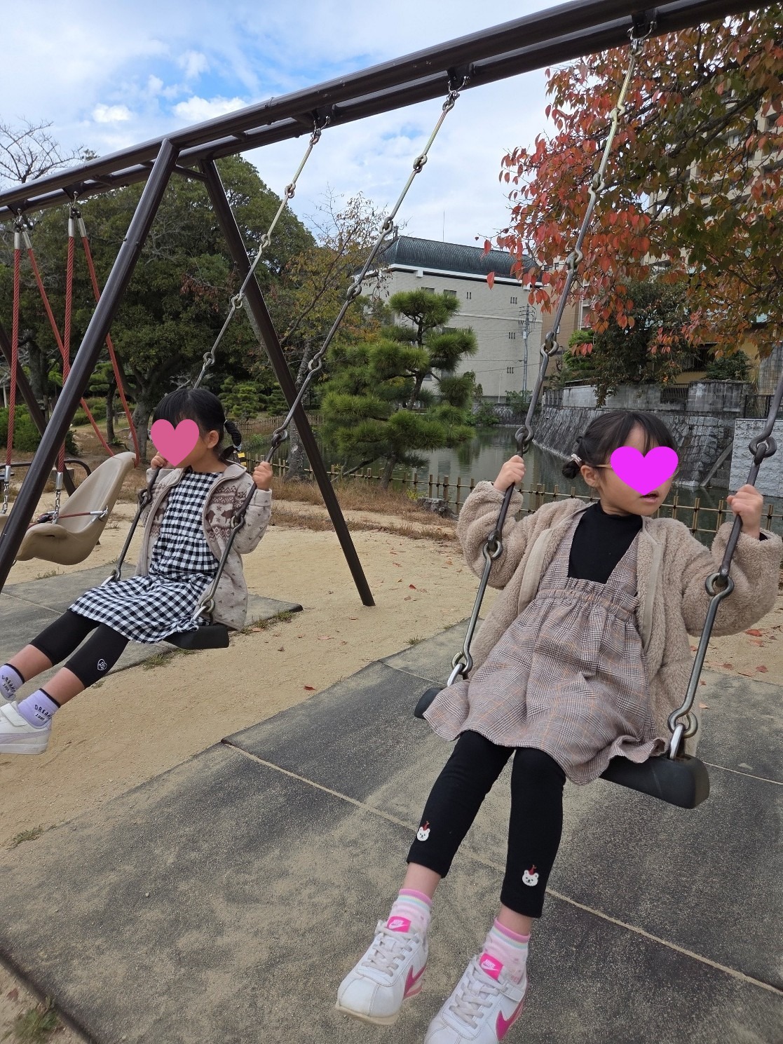公園では冬の訪れを感じさせる茶色く色づいた落ち葉を手に子どもたちもハイテンションです!